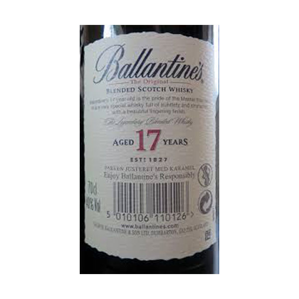 - Rượu Ballantines 17 năm thể hiện tất cả những hương vị thuần túy nhất của Dòng rượu Whisky pha trộn của Scotland ( Blender Scotch Whisky ) , là sự kết hợp tỷ mỷ của các loại Whisky Mạch nha và Whisky Lúa mạch đến từ nhiều vùng khắp đất nước Scotland . Với mầu vàng hổ phách , hương vị của Trái cây và gỗ Sồi đã tạo nên sự độc đáo riêng đưa Ballantines 17 năm trở thành một trong những loại Whisky cổ điển được đánh giá cao trên Thị trường Việt Nam và Thế giới